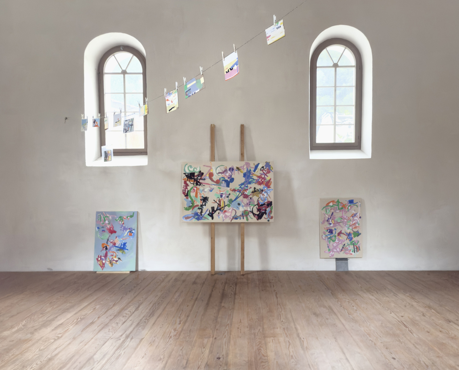 Smaller works hanging above: collages, mainly gouache on cardboard and paper